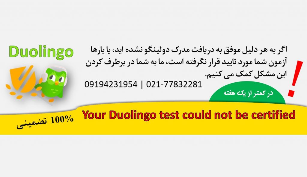 اگر به هر دلیل موفق به دریافت مدرک دولینگو نشده اید، یا بارها آزمون شما مورد تایید قرار نگرفته است و invalid شده است، ما به شما در برطرف کردن این مشکل کمک می کنیم.